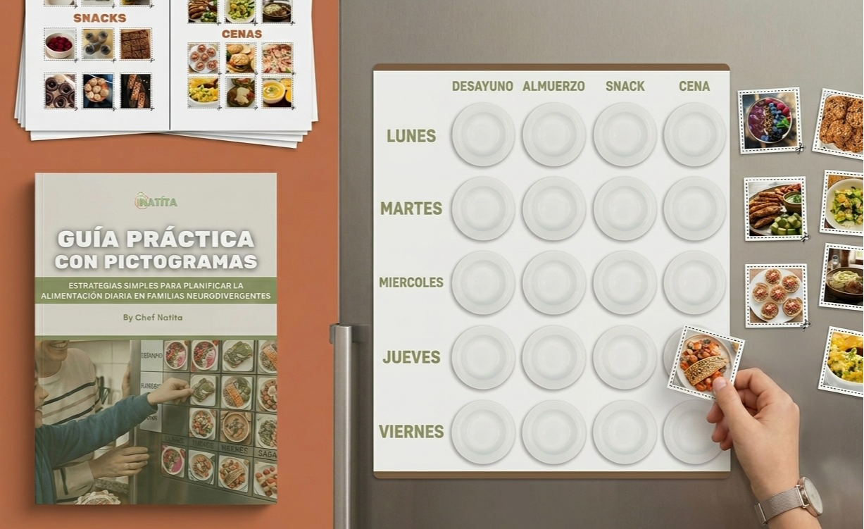 Un sistema visual con pictogramas + recetas simples que ayuda a organizar las comidas y mejorar el vínculo con la comida en casa.